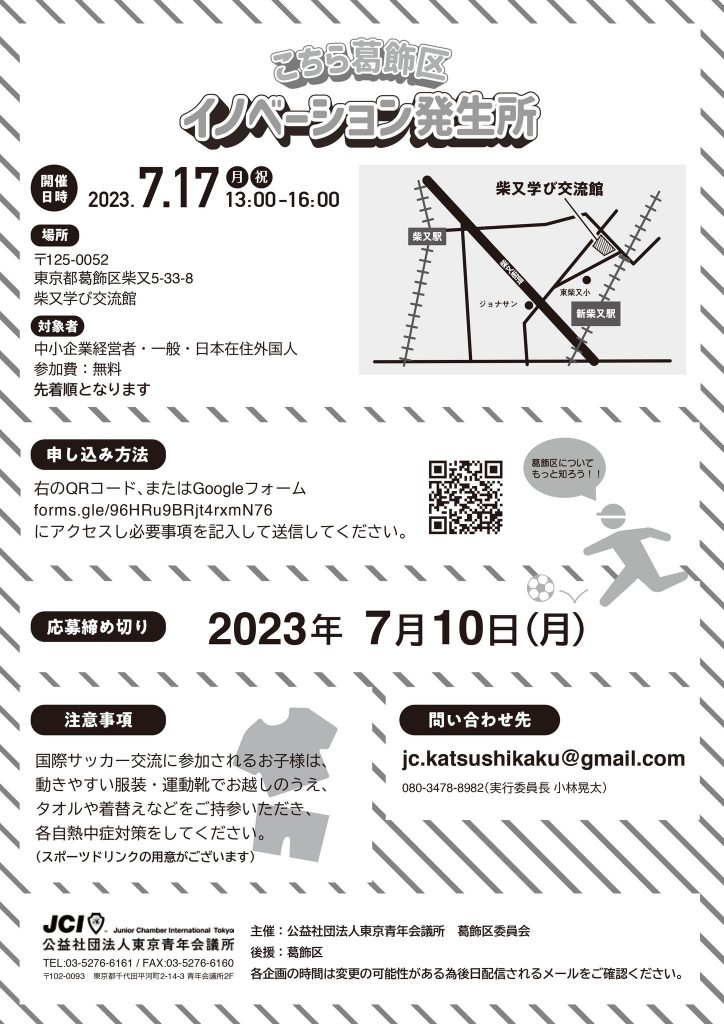 公益社団法人東京青年会議所葛飾区委員会では7月17日(月・祝日)に、柴又学び交流館にて「こちら葛飾区イノベーション発生所!」を開催いたします。