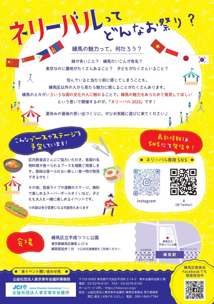 公益社団法⼈東京⻘年会議所 練⾺区委員会は、2023年8⽉27⽇(⽇)に練⾺区⽴平成つつじ公園(練⾺駅より徒歩1分)で「練⾺の魅⼒再発⾒!ネリーバル2023」を開催いたします!