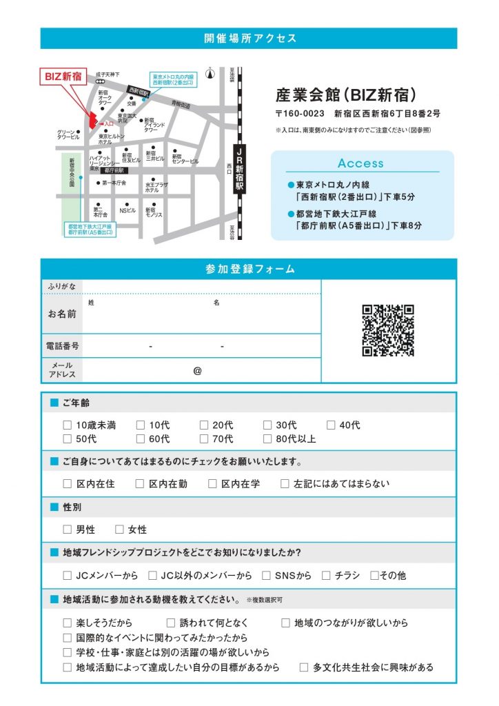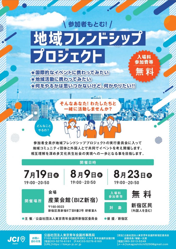 | 問い合わせ先 | 公益社団法⼈東京⻘年会議所 事務局 公益社団法⼈東京⻘年会議所新宿区委員会 〒102-0093 東京都千代⽥区平河町 2-14-3 ⻘年会議所会館2F TEL:03-5276-6161/FAX:03-5276-6160 |