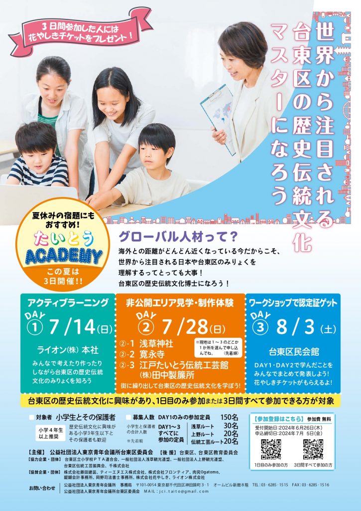公益社団法人東京青年会議所台東区委員会は2024年7月14日(日)、2024年7月28日(日)、2024年8月3日(土)に台東区内の小学生と保護者の方を対象としたグローバル人材育成教育プロジェクト「たいとうACADEMY」を開催いたします。
