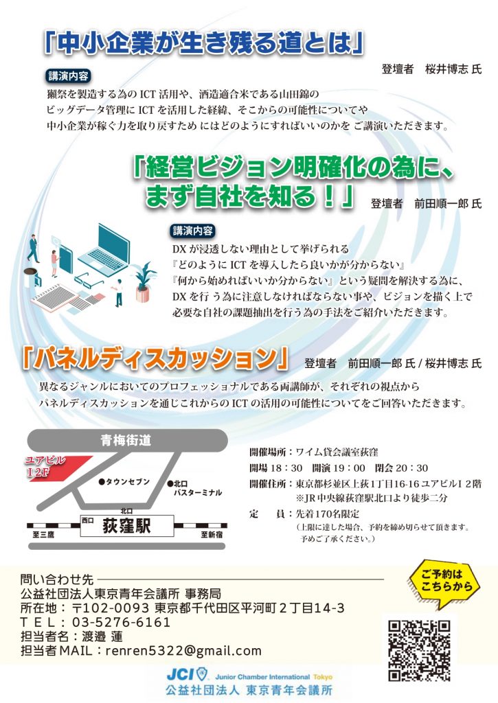 | 問い合わせ先 | 公益社団法⼈東京⻘年会議所 事務局 東京都千代⽥区平河町2-14-3 ⻘年会議所会館2F TEL:03-5276-6161 |
