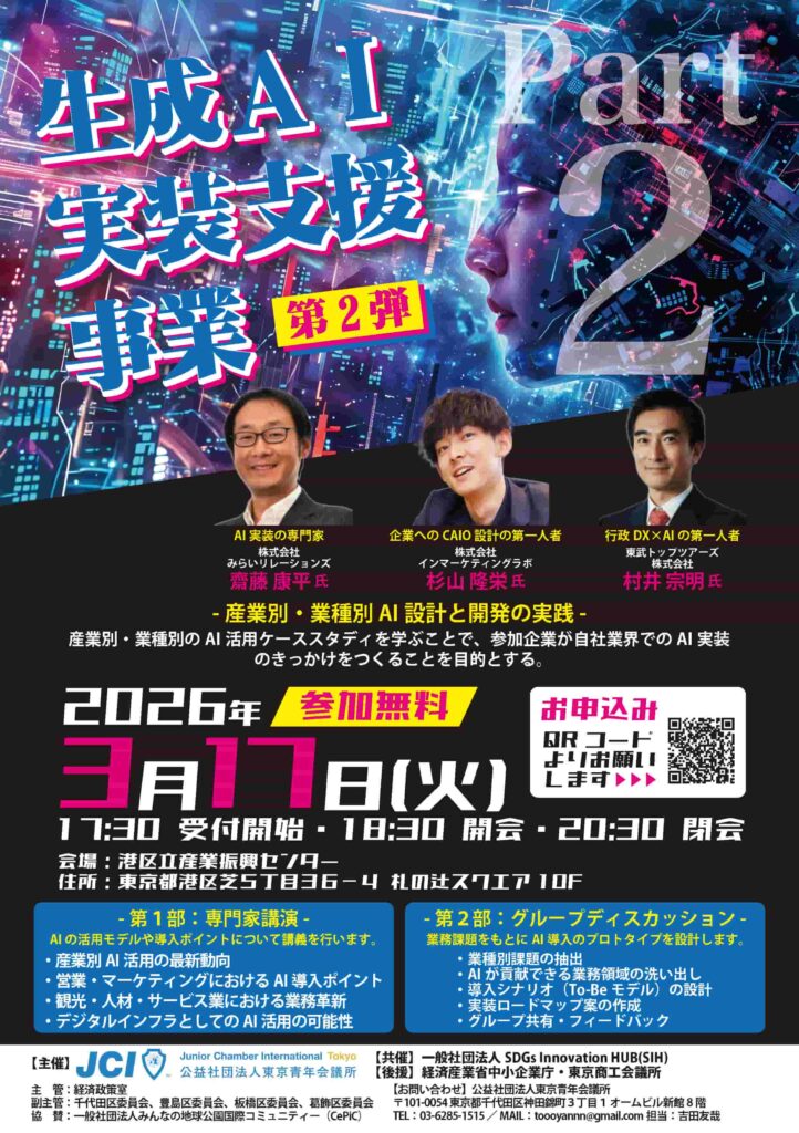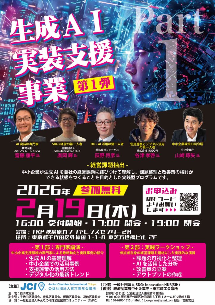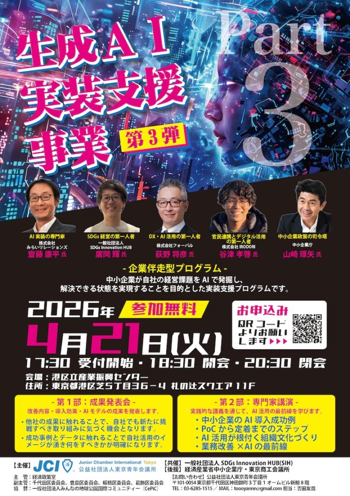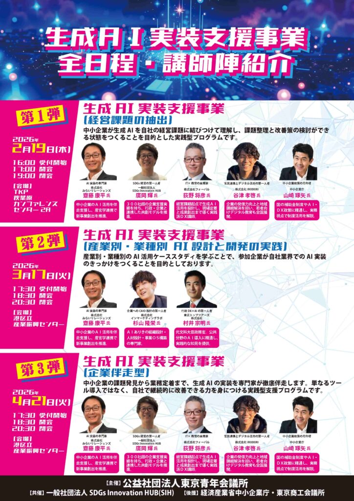 本事業は、中小企業が自社の経営課題を正しく把握し、生成AIを活用した改善策を検討・実装できる状態をつくることを目的とした 実践型支援プログラム です。