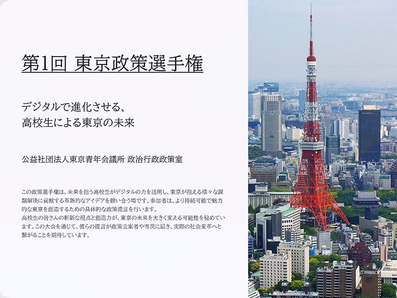 東京の社会課題に向き合い、政策提案で解決を目指す高校生・大学生のための政策コンテストです。若者の政治参加と主権者意識の向上を目的に、初開催となる本イベントを通じて、東京から全国へ新たな政策提案の波を起こします。