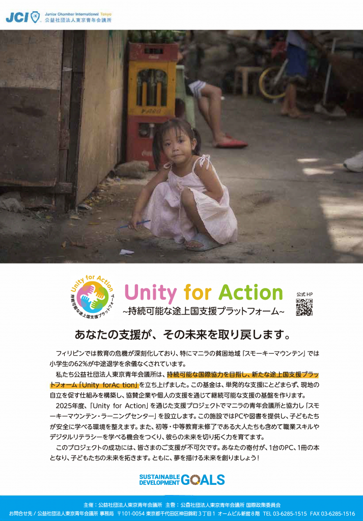 私たち公益社団法人東京青年会議所は、持続可能な国際協力を目指し、新たな途上国支援プラットフォーム「Unity for Action」を立ち上げました。この基金は、単発的な支援にとどまらず、現地の自立を促す仕組みを構築し、協賛企業や個人の支援を通じて継続可能な支援の基盤をつくります。
