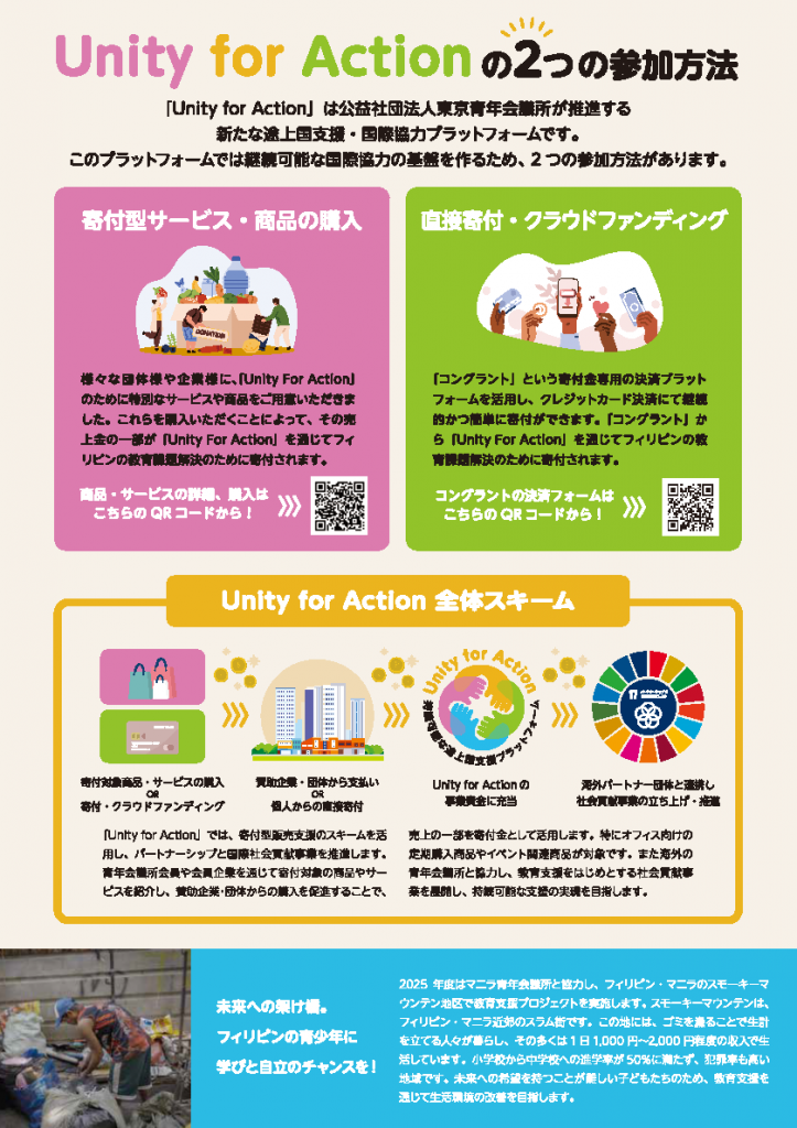 Unity for Actionとは持続可能な国際協力を目指す、新たな途上国支援プラットフォーム(基金)です。2025年度はフィリピンへの教育支援を軸に活動を展開します。