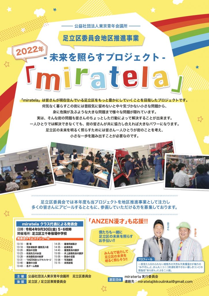 公益社団法⼈東京⻘年会議所 ⾜⽴区委員会(所在地:東京都千代⽥区平河町、理事⻑:⼭本健太)は、2022年9⽉30⽇(⾦)13時10分〜【未来を照らすプロジェクト『miratela』(ミラテラ)】の発表会を、⾜⽴区千寿桜堤中学校(東京都⾜⽴区柳原2-49-1)にて開催します。