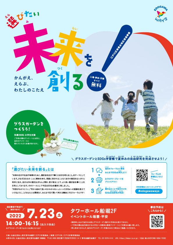 公益社団法⼈東京⻘年会議所 (所在地:東京都千代⽥区平河町、理事⻑:⼭本健太)江戸川区委員会は、2022年7⽉23⽇ (土) 14時から「選びたい未来を創る ーかんがえ、えらぶ、わたしのこたえー」を、タワーホール船堀(東京都江戸川区船堀4-1-1)2F イベントホール瑞雲・平安にて開催します。
