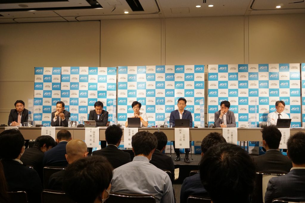例会では、国会に5議席以上をもつ政党からの代表1名ずつに登壇いただき、2ちゃんねる創始者でもあり、YouTubeチャンネルには144万⼈の登録者のいる⻄村博之⽒、番組パーソナリティ、イベント司会を務める百花繚乱⽒を交えて議論を交わして頂きました。
