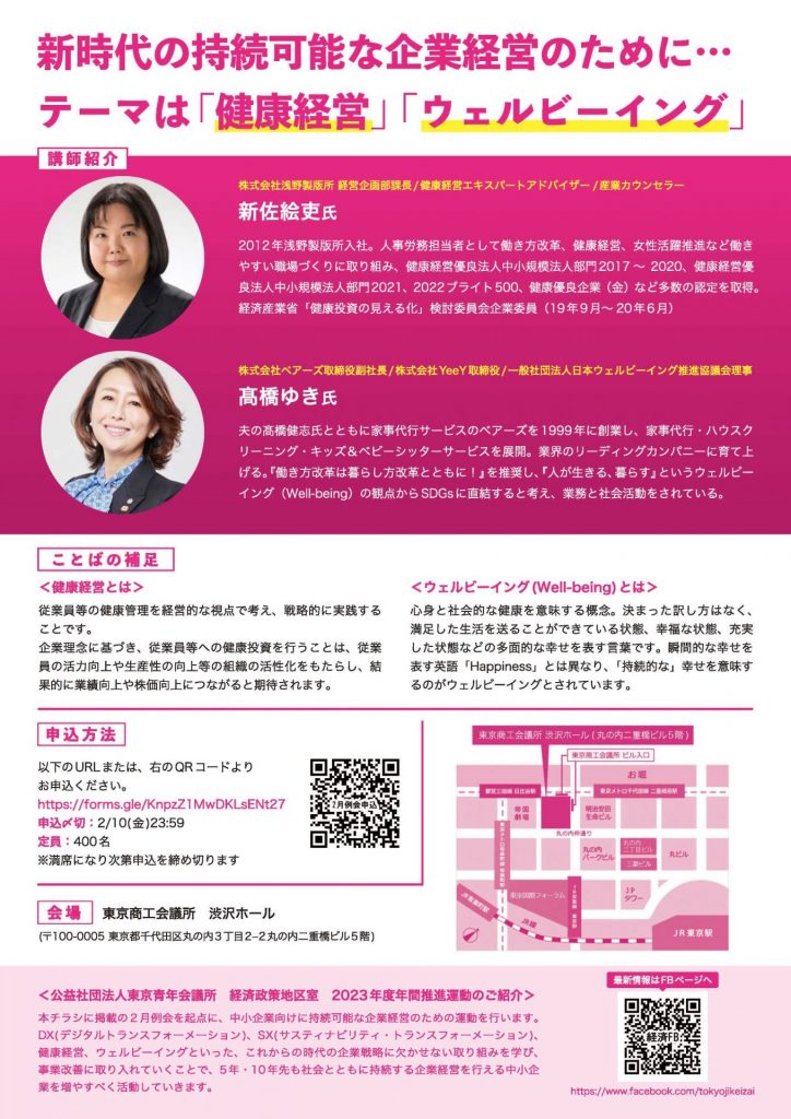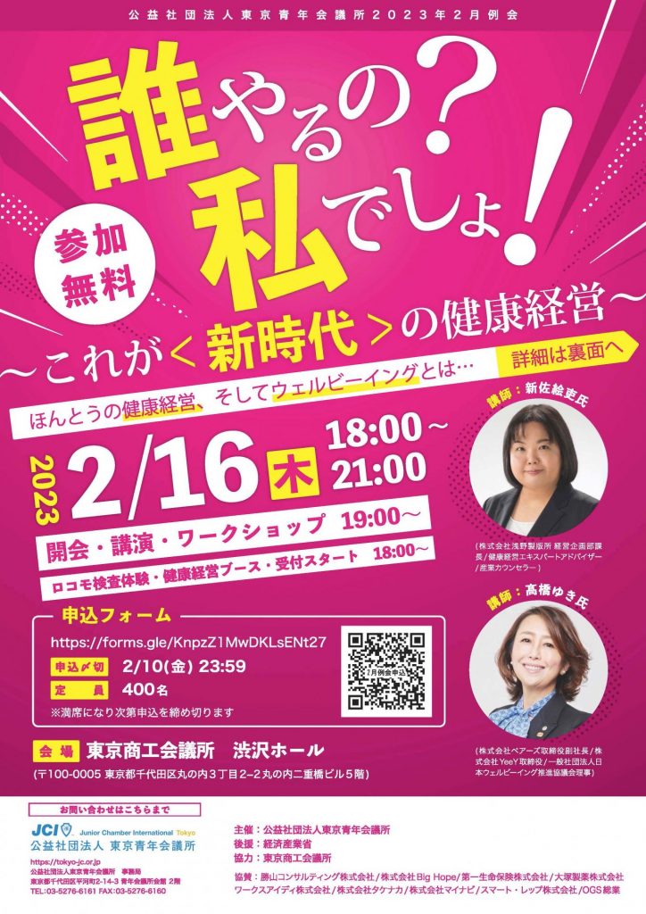 公益社団法⼈東京⻘年会議所 経済政策地区室(所在地:東京都千代⽥区平河町 理事⻑:下⼭⽥敬介)は、2023年2⽉16⽇(⽊) 19時より「誰やるの?私でしょ!〜これが<新時代>の健康経営〜」を東京商⼯会議所 渋沢ホールにて開催いたします。