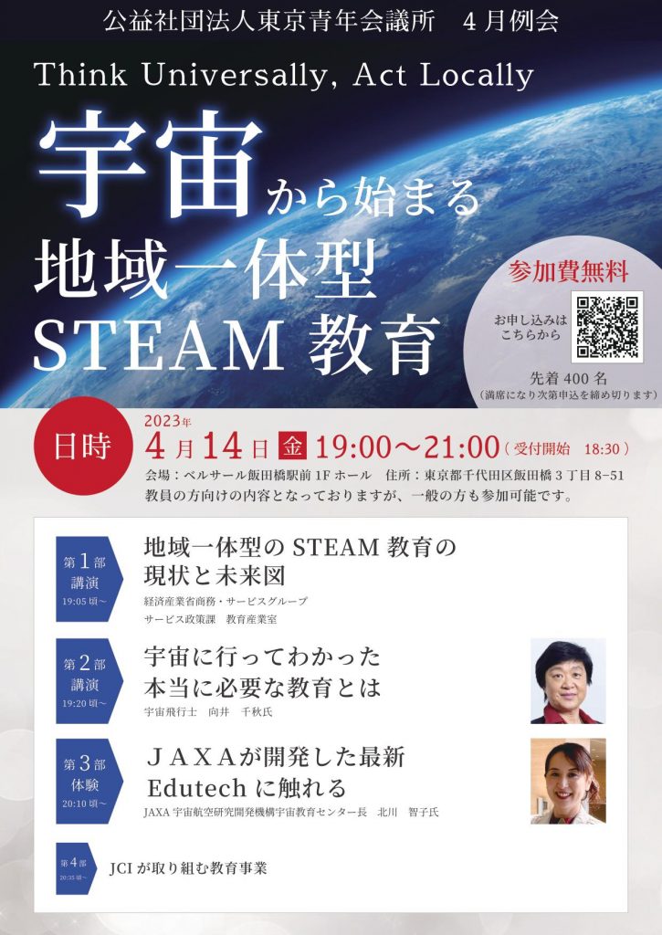公益社団法⼈東京⻘年会議所 教育政策地区室(所在地:東京都千代⽥区平河町、理事⻑:下⼭⽥ 敬介)は、2023年4⽉14⽇(⾦)19時〜〜Think Universally,Act Locally〜 宇宙から始まる地域⼀体型STEAM教育(ベルサール飯⽥橋駅前1Fホール)を開催いたします。