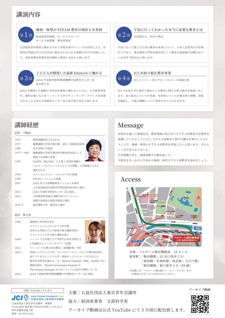 | 登壇者 | 第1部 基調講演「地域⼀体型のSTEAM教育の現状と未来図」 • 柴⽥ 仁志(しばた ひとし) ⽒|経済産業省商務・サービスグループ サービス政策課 教育産業室⻑補佐 <経歴> 2015年 ⽂部科学省⼊省 2022年7⽉より 経済産業省教育産業室室⻑補佐 (⽂部科学省より出向) 第2部 基調講演&トークセッション「宇宙に⾏ってわかった本当に必要な教育とは」 • 向井 千秋(むかい ちあき)氏|宇宙飛行士 <経歴> 1952年 群⾺県館林市に⽣まれる 1977年 慶應義塾⼤学医学部卒業。同年、医師免許取得 1988年 同⼤学博⼠号取得 1977〜1985年 慶應義塾⼤学医学部外科学教室医局員として病院での診療に従事。 1994年 NASDA(現JAXA)により第1次材料実験のペイロードスペシャリストとして⽑利衛、⼟井隆雄とともに選定される 1998年 STS-95ミッションに搭乗 2007年 JAXA有⼈宇宙環境利⽤ミッション本部有⼈宇宙技術部宇宙医学⽣物学研究室室⻑に就任 2012年 JAXA宇宙医学研究センター⻑に就任 2014年 宇宙開発利⽤部会 国際宇宙ステーション・国際宇宙探査⼩委員に就任 2015年4⽉ 東京理科⼤学 副学⻑に就任 第3部 みんなでSTEAM体験「JAXAが開発した最新Edutechに触れる」 • 北川 智⼦(きたがわ ともこ)氏|JAXA 宇宙航空研究開発機構 宇宙教育センター⻑ <経歴> 1980年 福岡県⼤牟⽥市⽣まれ ブリティッシュコロンビア⼤学卒業 同学の⼤学院でアジア研究の修⼠課程を修了 プリントン⼤学で博⼠課程を修了 2009年 ハーバード⼤学東アジア学部で⽇本史を教える 3年連続でティーチングアワード受賞 2012〜2015年 ケンブリッジ⼤学客員研究員に所属 2015年 ドイツのボンにあるマックス・プランク数学研究所客員研究員 2016年 カルフォルニア⼤学・バークレー校の客員研究員 2022年 宇宙航空研究開発機構の宇宙教育センター⻑に就任 第4部 「JCIが取り組む教育事業」 • JCIグローバルユース国連⼤使 3名 |