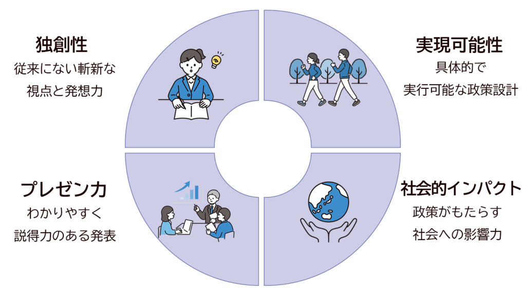 また、チームワークも重要な評価項目です。メンバー全員が協力し、一つの政策を作るプロセスについても審査対象とします。